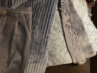 Für Teil 3 liegen zwei Stoffe bereit - hier kann ich noch nicht ganz entscheiden. Mittig liegt ein Poly-Irgendwass, samtweich, sieht aus wie mega grosser Cord und rechts eine Art Strick, innenseitig Fleece. Am liebsten würde ich aus beiden ein Blazer machen ;D